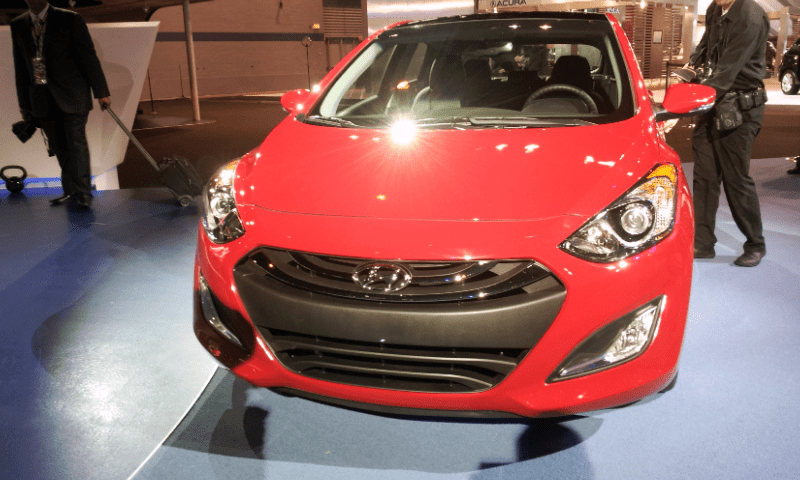 Head-on front view of the 2013 Hyundai Elantra GT in red, highlighting the wide trapezoidal grille, swept headlights with integrated LED daytime running lights, and Hyundai badge. The hatchback body style is visible through the greenhouse above.