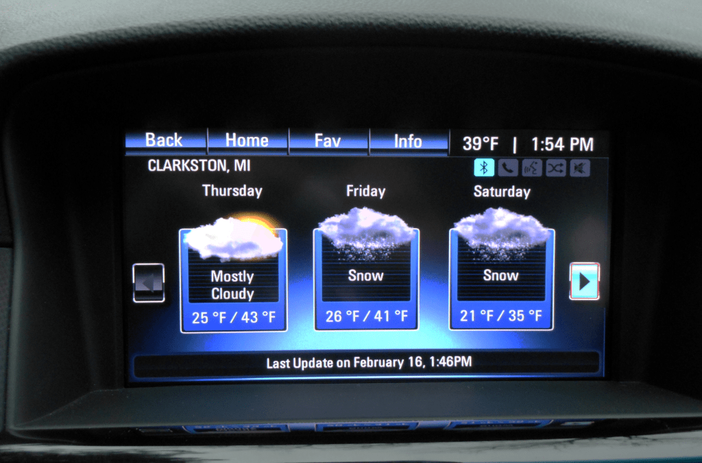 The 2012 Chevrolet Cruze LTZ infotainment system displays a three-day local weather forecast on its color screen, demonstrating the connected services capabilities available on this trim. The interface is intuitive and easy to read at a glance.