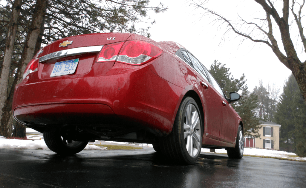 The 2012 Chevrolet Cruze LTZ is shown from a low-angle rear three-quarter perspective, highlighting the sedan's sloping roofline and sculpted rear haunches. The Crystal Red Tintcoat finish contrasts sharply against the wet pavement and winter backdrop.