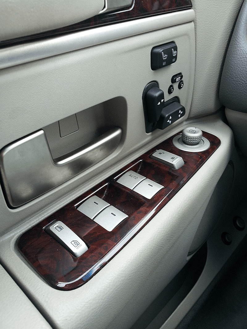 The driver's door panel of the 2011 Lincoln Town Car Signature Limited, showing power window switches, door lock controls, and mirror adjustment knob set in rich wood-grain trim. The panel exemplifies the Town Car's blend of traditional luxury materials in its final model year.