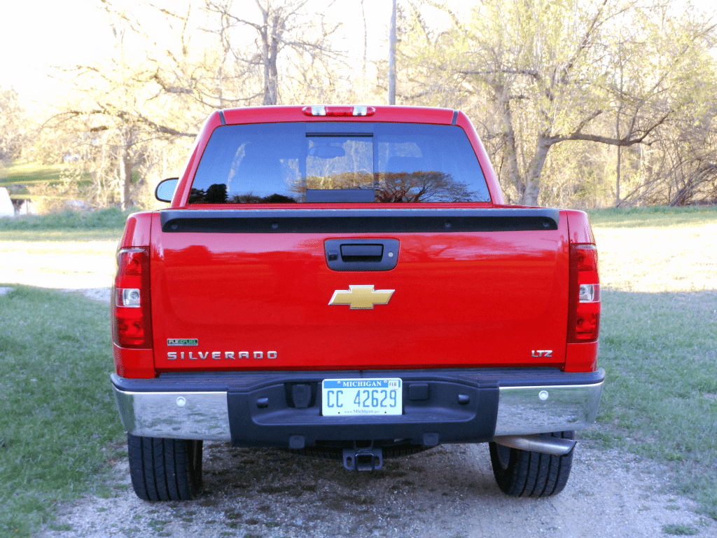 The rear of the Victory Red Silverado LTZ displays the chrome Chevrolet bowtie emblem and bold "SILVERADO" lettering across the tailgate. Chrome bumper step and dual exhaust outlets complete the truck's confident rear stance.