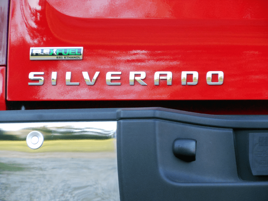 The bold "SILVERADO" nameplate badge is prominently displayed on the Victory Red door panel, with the FlexFuel badge positioned above indicating the truck's E85 ethanol capability. Chrome lettering contrasts sharply against the red body panel.