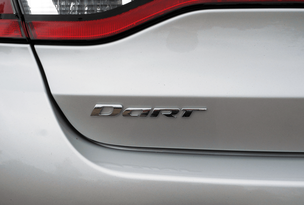 A tight close-up of the chrome "DART" name badge on the trunk lid of the silver 2013 Dodge Dart, with the corner of the taillamp visible above it. Reviving the storied Dart nameplate for 2013, Dodge used the bold block lettering as a prominent design element on the rear fascia.