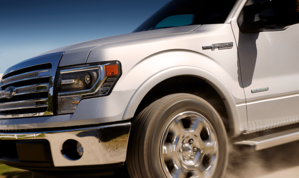 The silver 2013 Ford F-150 Lariat SuperCrew is captured in motion on a dirt road, kicking up dust as it moves through the frame. Both the F-150 fender badge and Lariat door badge are clearly visible on the truck's front quarter panel.