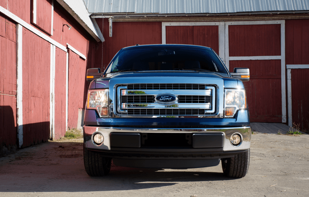 The 2013 Ford F-150 XLT is shown head-on from directly in front, parked between two red barn structures. The chrome grille, Ford oval badge, and projector-style headlights anchor the truck's commanding front fascia.