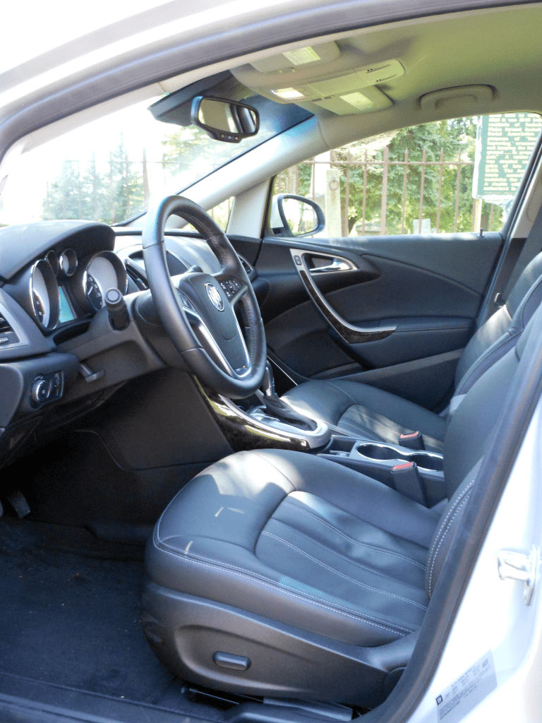 The driver's side front seating area features dark leather-trimmed bucket seats with contrast stitching, a leather-wrapped steering wheel, and a center console with cupholders and a covered armrest. The open-pore wood-look trim on the center stack adds a refined touch.