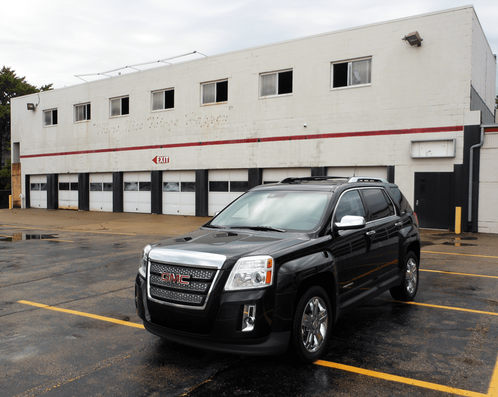 The 2012 GMC Terrain SLT-2 AWD in Carbon Black Metallic is parked in front of a commercial building, showing its bold front fascia with chrome-accented grille, LED accent lighting, and 18-inch aluminum wheels. The elevated hood line and upright stance give the compact crossover a confident road presence.