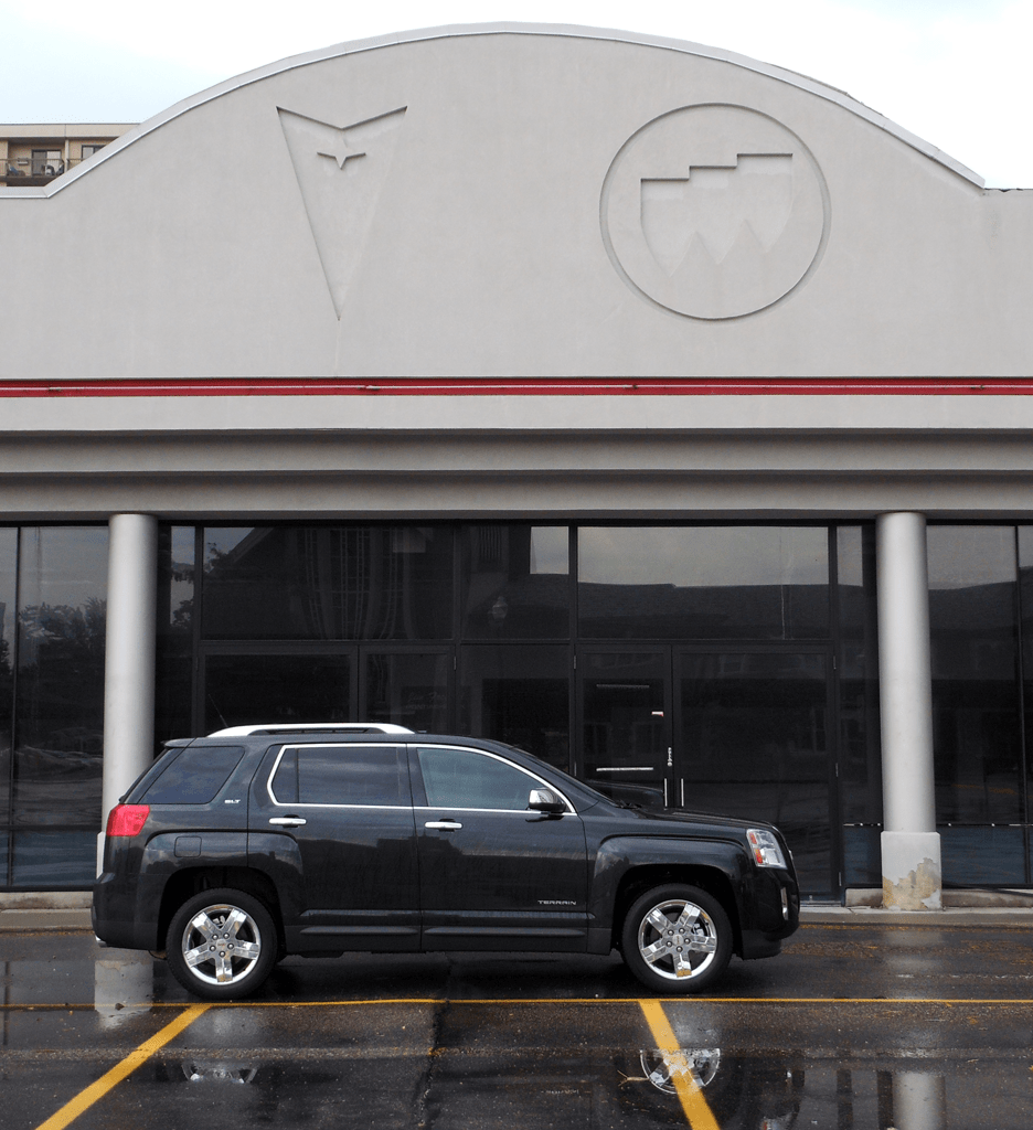 The 2012 GMC Terrain SLT-2 AWD in Carbon Black Metallic is shown in a full side profile, revealing the crossover's sculpted body lines and distinctive character line running the length of the doors. The Terrain is parked in front of a building facade decorated with circular vintage automotive brand emblems.