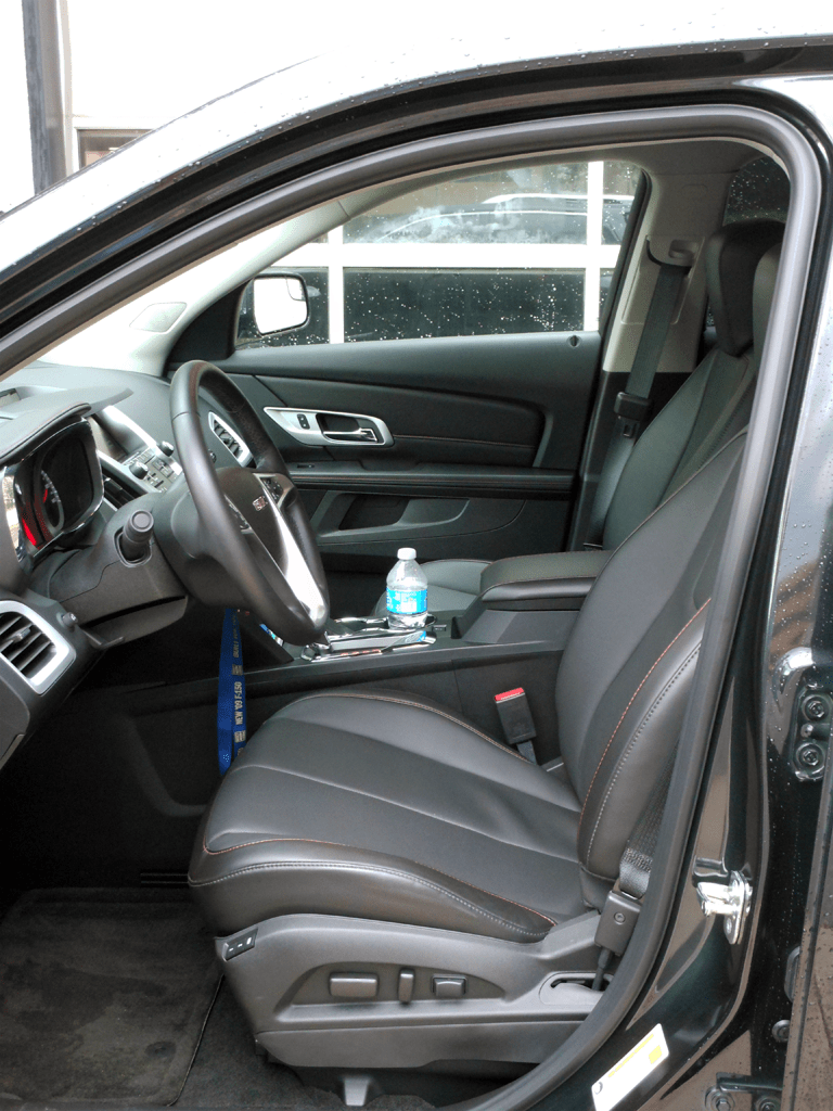 The driver's side of the Terrain SLT-2 shows well-bolstered dark leather bucket seats with power adjustment controls on the door sill. The center console with its covered armrest and cupholders is positioned between the front seats for easy driver access.