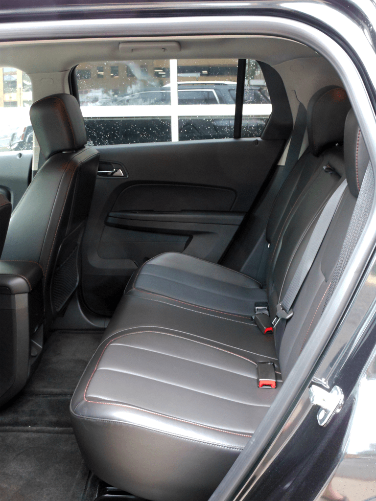 The Terrain SLT-2's rear seating area features dark leather-trimmed bench cushions with contrast stitching and ample hip and legroom for adult passengers. The upright seatback and large rear windows create a comfortable, airy environment in the second row.