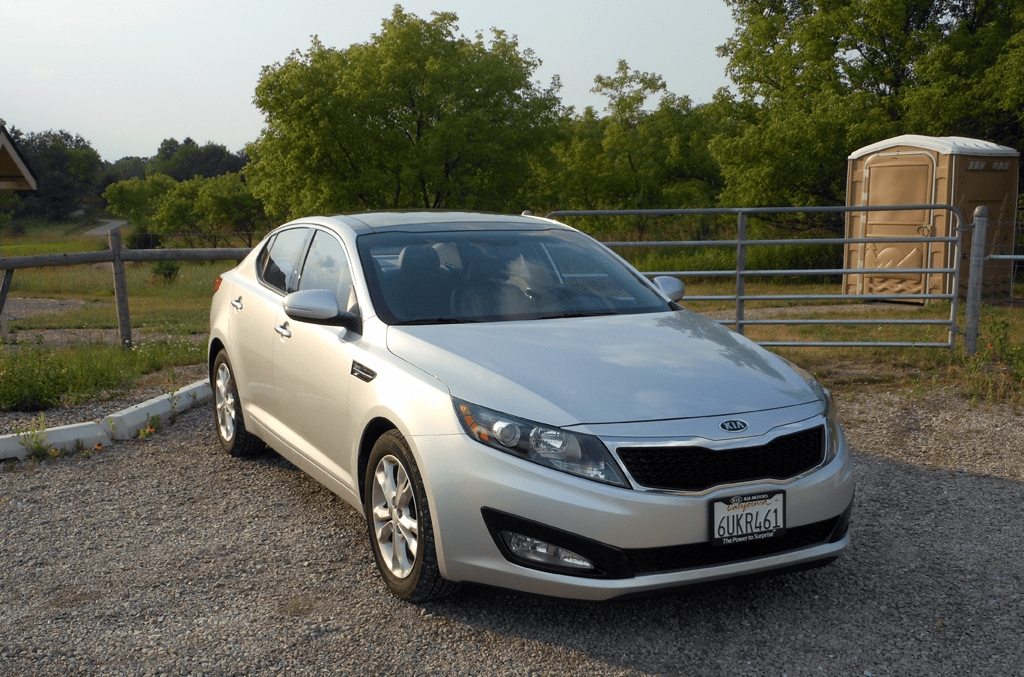 The 2012 Kia Optima EX photographed from the front three-quarter angle in a rural setting, showing off the sedan's wide lower air intake, mesh grille insert, and projector headlights. The Optima's design was a major step forward for Kia's brand image when it debuted.