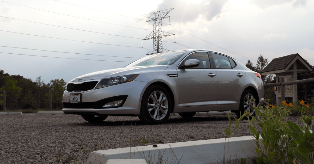 Shot under a dramatic overcast sky, this front three-quarter view of the 2012 Kia Optima EX emphasizes the sedan's bold grille, swept headlights, and confident stance. The Optima's European-inspired design language set it apart from the mid-size segment crowd when it arrived.