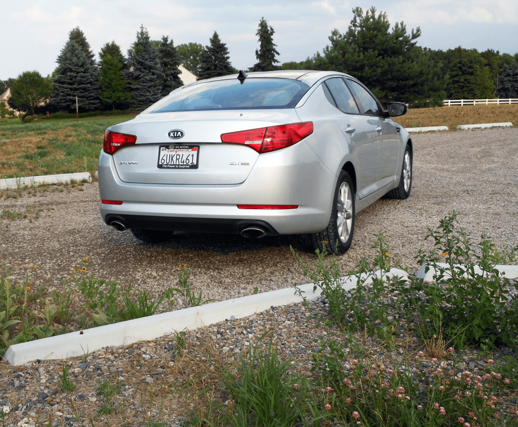 The rear three-quarter view of the 2012 Kia Optima EX highlights the sedan's low, fastback-influenced roofline and wide stance. The dual exhaust outlets and clean bumper design give the Optima a polished look from every angle.