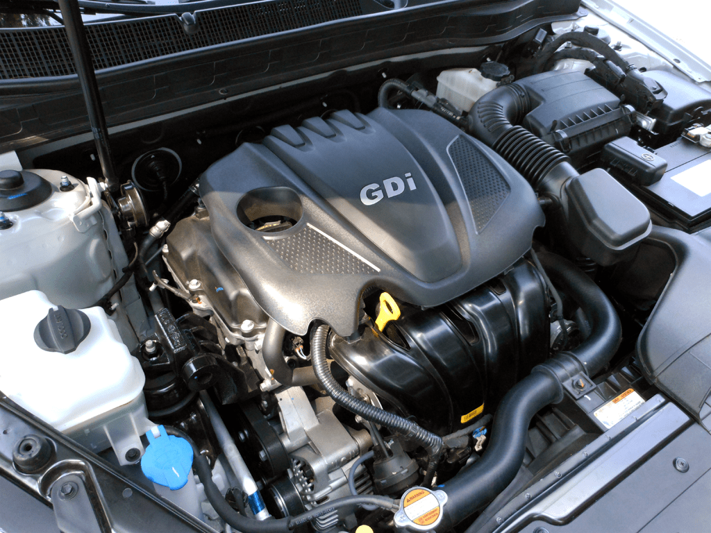 The 2012 Kia Optima EX is powered by a 2.4-liter GDi four-cylinder engine, visible here with its distinctive cover badge. Gasoline Direct Injection technology helps the Optima balance respectable power output with competitive fuel economy numbers.
