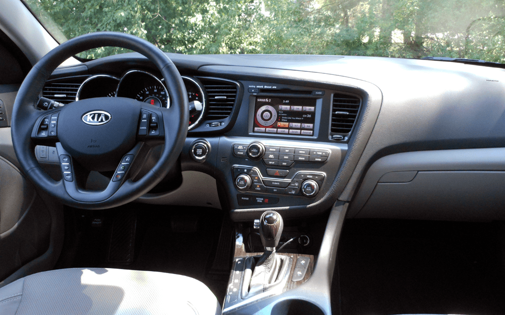 The 2012 Kia Optima EX interior shows a driver-focused dashboard with a leather-wrapped three-spoke steering wheel, center touchscreen infotainment display, dual-zone automatic climate controls, and a piano black center console with chrome trim accents. The light beige leather seating surfaces and soft-touch surfaces give the cabin a premium appearance.
