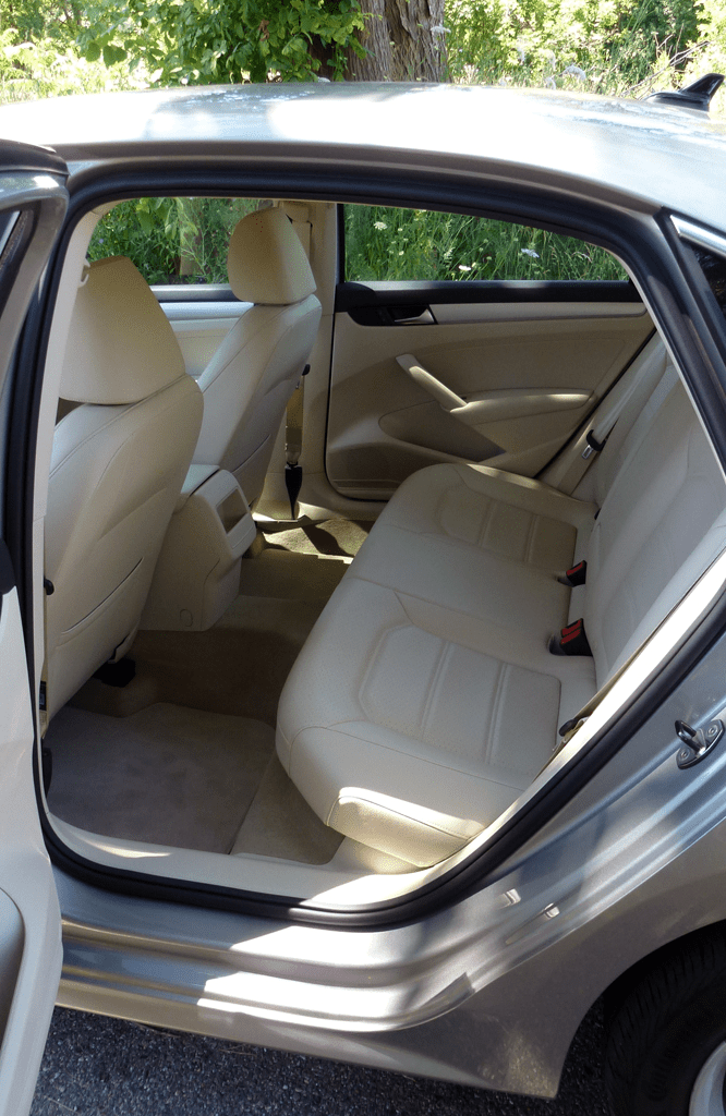 The rear cabin of the 2012 Volkswagen Passat 2.5 SE offers generous legroom and comfortable seating for two adults, trimmed in beige cloth with a flat floor enhancing center-passenger comfort. The wide door opening and low sill make entry and exit easy.