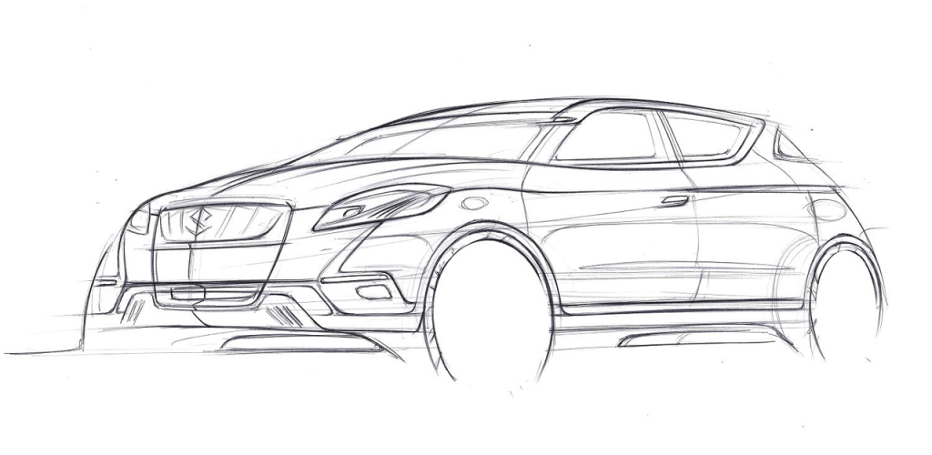 A pencil design sketch reveals the Suzuki S-Cross in three-quarter front view, showing the proportions and styling direction that would become the SX4 Crossover sold in international markets. The sketch captures the crossover's tall roofline, wide wheel arches, and prominent Suzuki badge that define the production model.