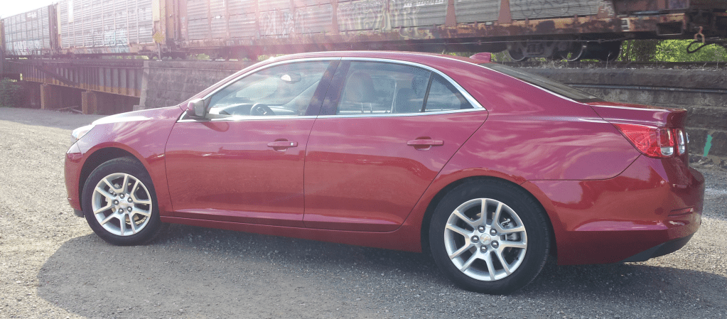 2013 Chevrolet Malibu Eco Side Profile Next to Freight Train