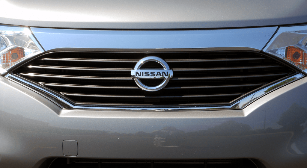 A detailed close-up of the 2012 Nissan Quest LE's front grille shows the chrome Nissan badge centered on a wide, horizontal chrome bar with horizontal slat texture and a dark background. The chrome surround frames the badge prominently and connects to the silver body panels on either side, with the amber turn signal lenses of the headlights visible at the corners. This distinctive grille treatment gave the Quest a cleaner, more upmarket front-end look than many of its minivan rivals.