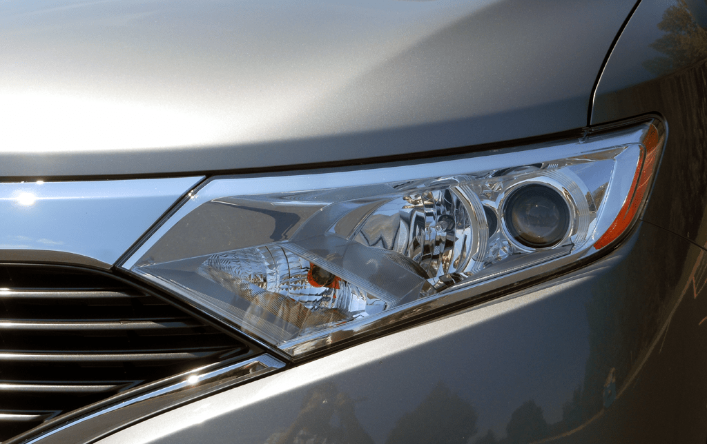 The driver's side headlight of the 2012 Nissan Quest LE features a projector beam element within a sweep-shaped housing finished with chrome accents, integrated amber turn signal lens, and a clear outer lens. The sharp, angular lines of the headlight surround connect to the hood and the grille surround for a cohesive, modern front-end design. The chrome trim catches the sun on the silver body, adding to the LE trim's upmarket appearance.
