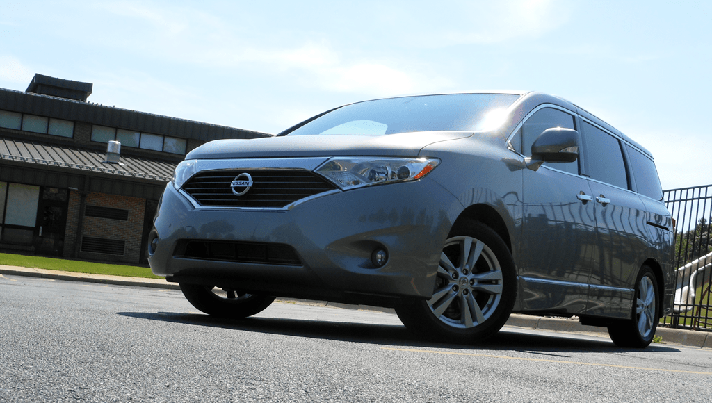 A low-angle front three-quarter view of the 2012 Nissan Quest LE in silver, emphasizing the minivan's wide stance and sculpted hood. The bold grille, Nissan badge, and swept headlights are prominent from this dramatic ground-level perspective.
