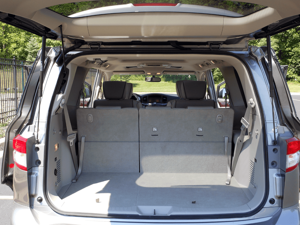 The expansive cargo area of the 2012 Nissan Quest LE with the third-row seats folded flat, showing the flat load floor and maximum cargo capacity. With the rear seats down, the Quest offers ample room for large loads, making it well-suited for family hauling duties.