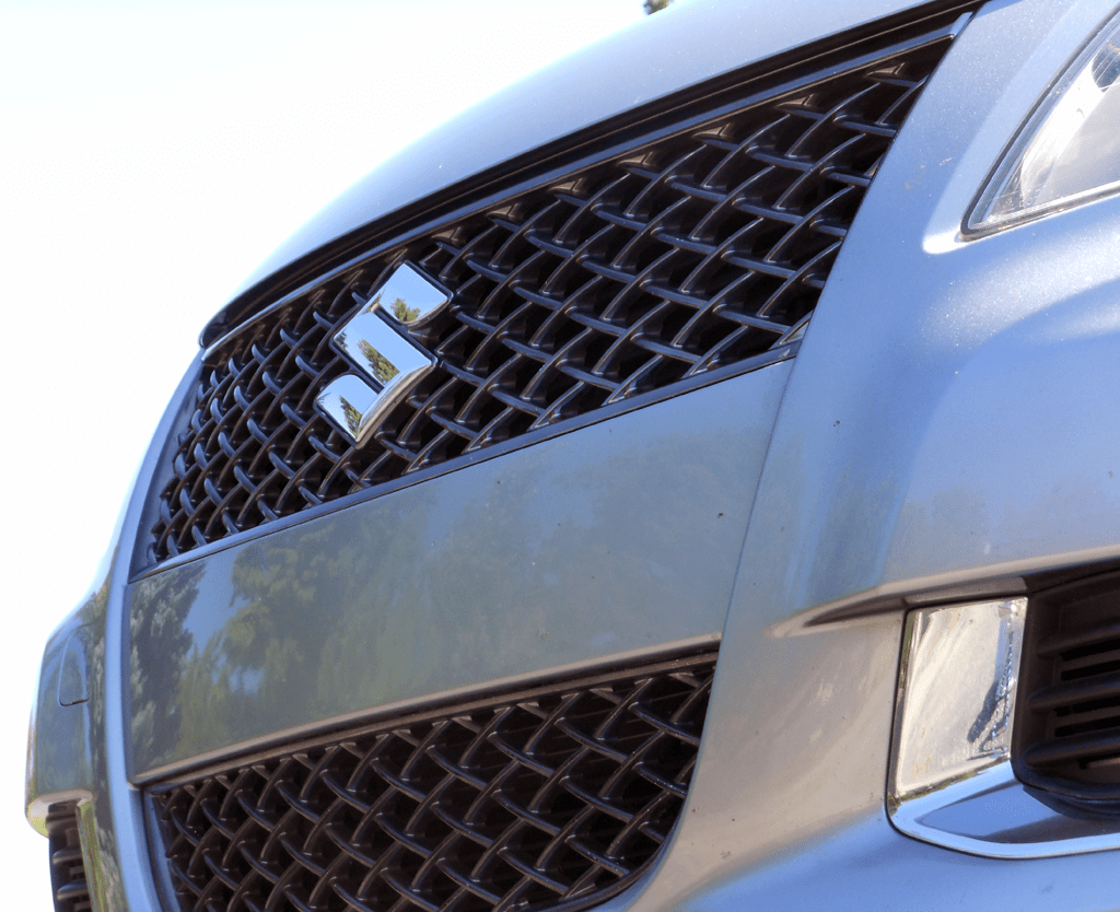 A tight close-up of the 2012 Suzuki Kizashi Sport GTS AWD's front grille shows the blacked-out mesh insert and chrome Suzuki S badge that define the Sport GTS's more aggressive face compared to standard Kizashi trims. The contrasting black mesh against the light blue metallic body creates a bold, purposeful look.