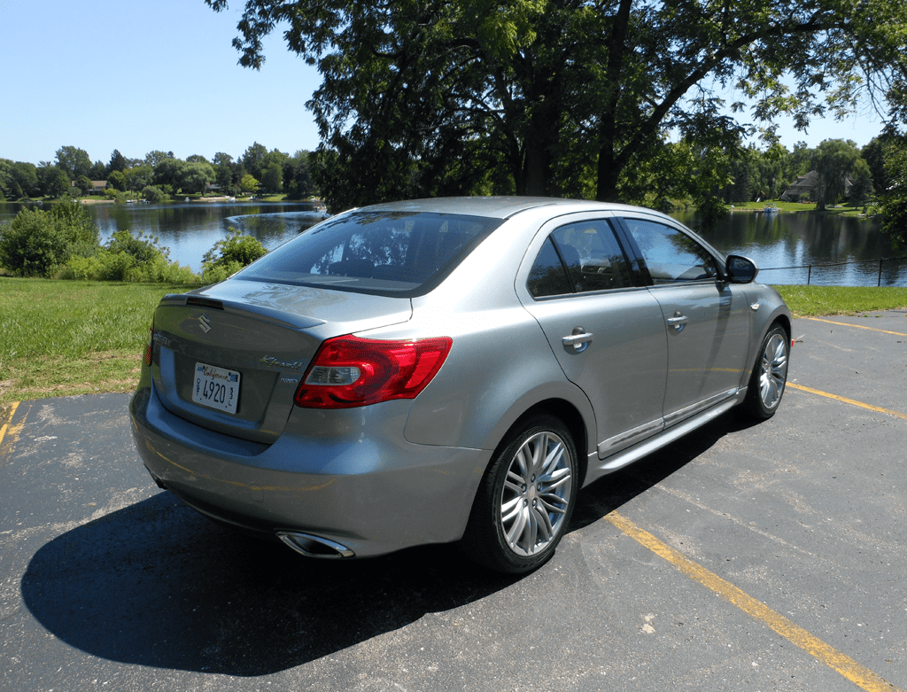 From the rear three-quarter angle, the 2012 Suzuki Kizashi Sport GTS AWD's muscular haunches and fastback-inspired roofline are apparent, with the chrome exhaust tips and sport alloy wheels adding an upscale finish to the light blue metallic exterior. The lakeside setting frames the Kizashi as a refined, capable sport sedan.