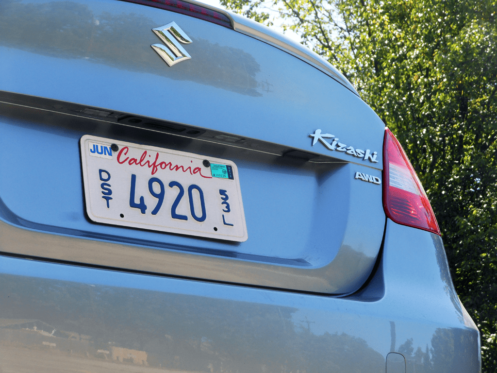 The trunk lid of the 2012 Suzuki Kizashi Sport GTS AWD shows off the chrome "Kizashi" nameplate and separate "AWD" badge alongside Suzuki's distinctive S-shaped logo, all set against a light blue metallic finish. The clean trunk styling and integrated spoiler lip give the sedan a polished, sporty look from behind.