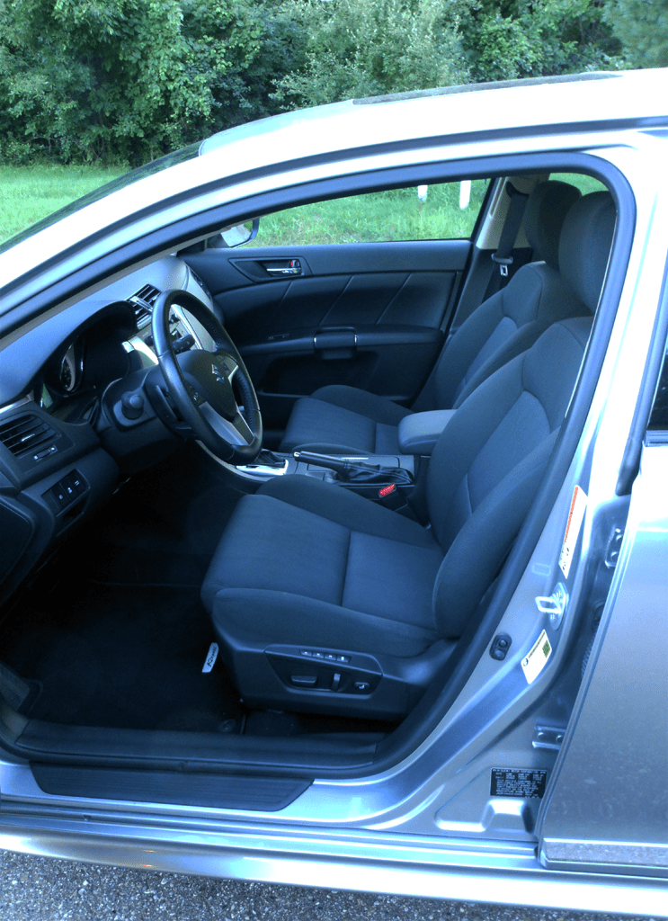 The 2012 Suzuki Kizashi Sport GTS AWD's front sport seat is shown with the driver's door open, revealing well-bolstered dark cloth upholstery and a sporty center console with a short-throw gear selector. The supportive seating position and clear sightlines to the instrument cluster reinforce the Kizashi's sport sedan character.