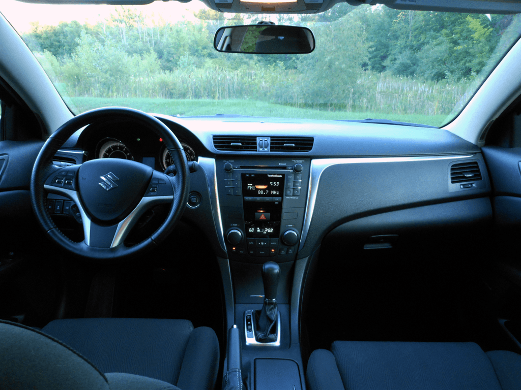 The 2012 Suzuki Kizashi Sport GTS AWD's cockpit features a sport-focused dark interior with a Rockford Fosgate touchscreen audio system embedded in the center stack, flanked by chrome-trimmed climate controls and a Suzuki-badged leather steering wheel. The clean, horizontal dash design gives the cabin a premium feel that punched above the Kizashi's price class.