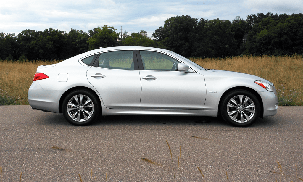 A full side profile of the silver 2012 Infiniti M Hybrid showcases its long hood, gently sloping roofline, and sculpted body lines that flow from front to rear. The sedan's athletic stance is underscored by the large alloy wheels filling each corner of the bodywork.