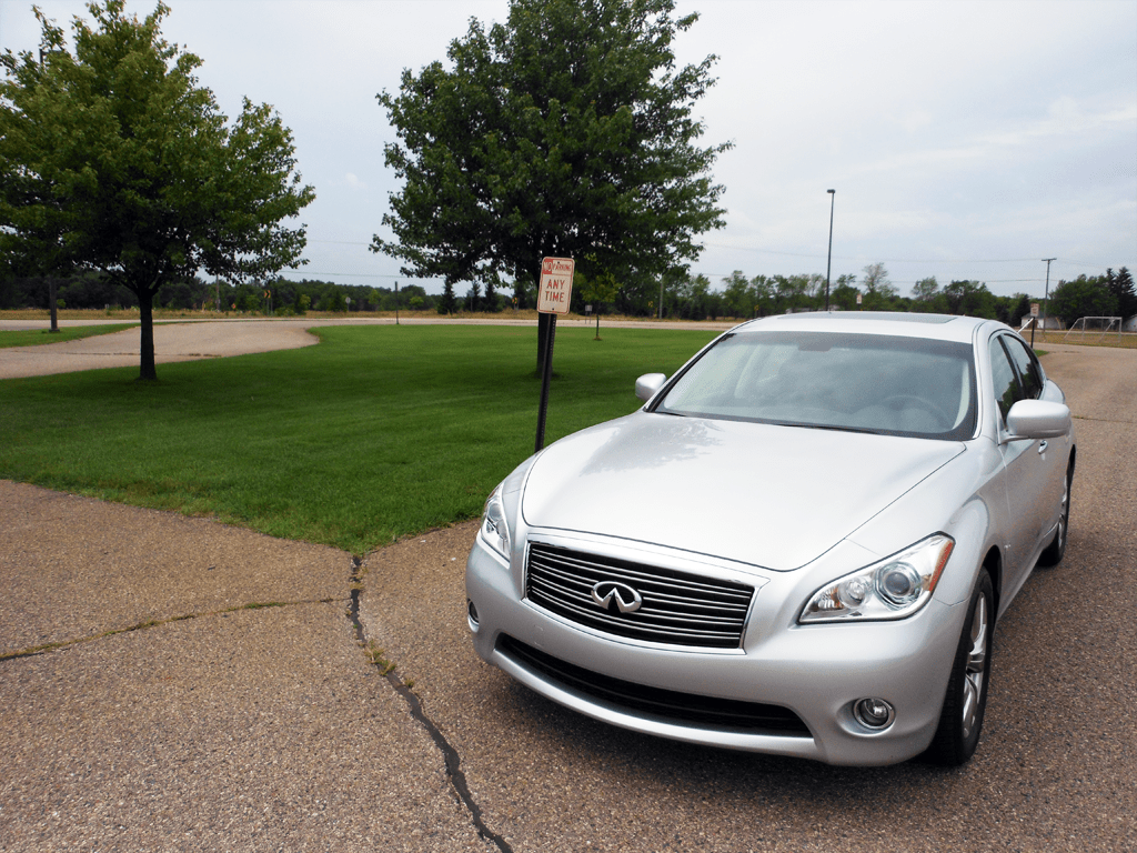 The silver 2012 Infiniti M Hybrid is photographed from a front three-quarter angle in an outdoor setting, showcasing its swept headlights, prominent grille, and athletic sedan proportions. The low roofline and flowing bodywork give the M Hybrid a sporty presence despite its luxury-hybrid mission.