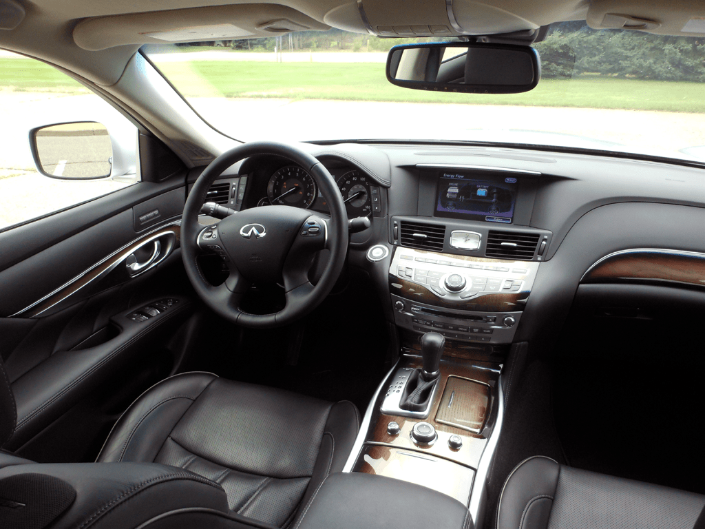 The 2012 Infiniti M Hybrid's interior features a driver-focused cockpit with a large center-mounted infotainment screen, wood and leather trim accents, and a multi-function steering wheel. Premium materials and a clean layout reflect the M Hybrid's luxury positioning.