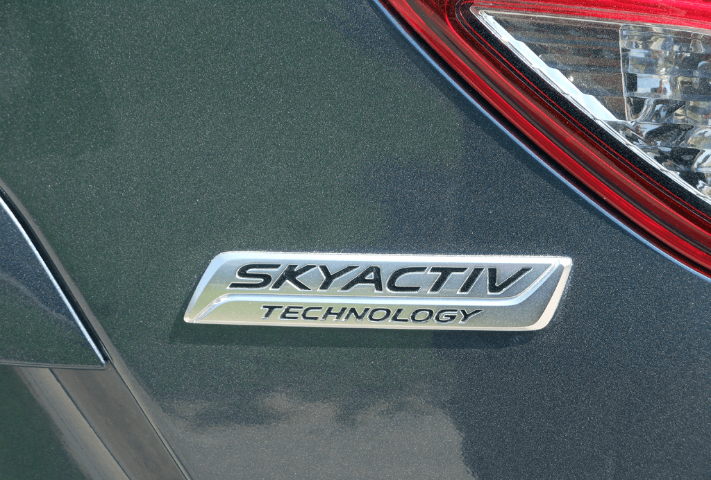 The SKYACTIV TECHNOLOGY badge on the rear liftgate of the 2013 Mazda CX-5 Touring signifies the use of Mazda's suite of fuel-efficient engine, transmission, body, and chassis technologies that improve fuel economy without sacrificing driving dynamics.