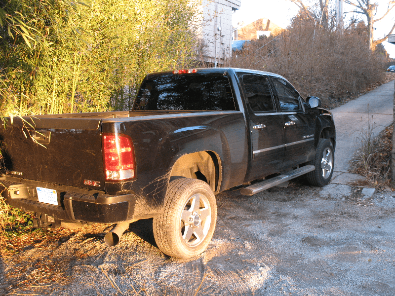 The 2011 GMC Sierra Denali 2500 HD Crew Cab photographed from the rear passenger-side angle outdoors, with evidence of real-world use visible on the rear wheel wells. The tailgate and dual exhaust tips are visible from this angle.