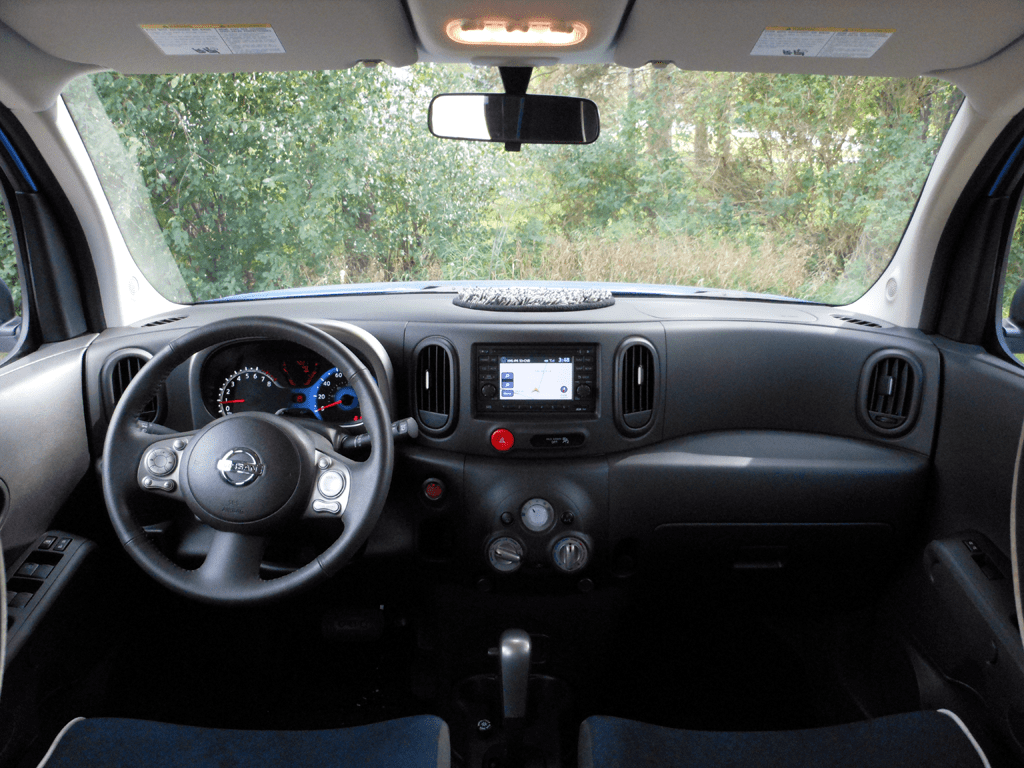 The 2012 Nissan cube 1.8S Indigo Special Edition features an asymmetric wraparound dashboard design with a central infotainment display, three-spoke steering wheel, automatic climate controls, and a panoramic roof adding light to the boxy cabin.