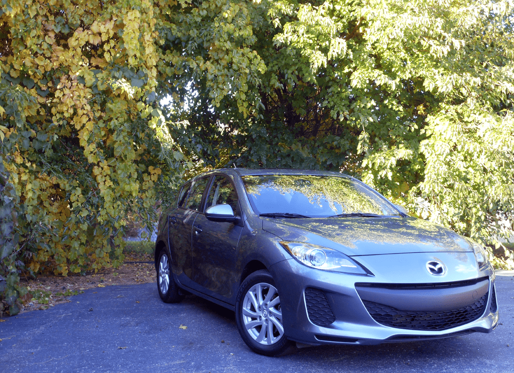 The 2012 Mazda3i Grand Touring Hatchback photographed from the front three-quarter angle against a backdrop of autumn foliage. The dark gray metallic paint, swept headlights, and muscular front fascia showcase the Mazda3's sharp design.