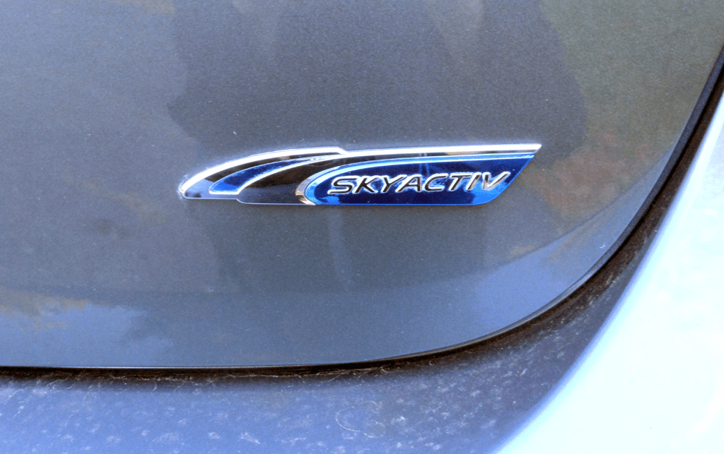 A close-up of the SKYACTIV badge on the 2012 Mazda3i Grand Touring Hatchback. The blue and chrome emblem on the dark gray body panel signifies the car's fuel-efficient SKYACTIV technology suite.