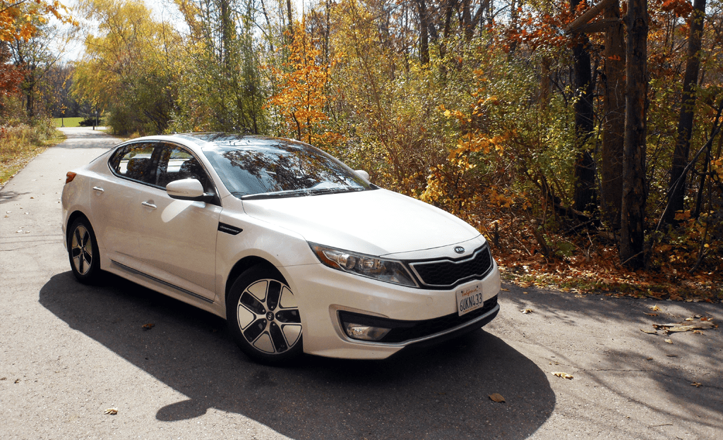 Front three-quarter view of the white 2012 Kia Optima Hybrid on a wooded road in fall, capturing the European-influenced styling that helped Kia transform its brand image in the early 2010s.