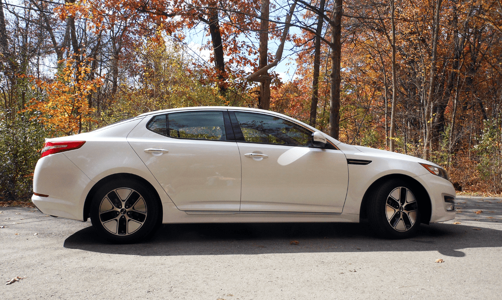 Side profile of the white 2012 Kia Optima Hybrid in autumn surroundings, displaying the long, low-slung sedan silhouette with coupe-like roofline and aerodynamic alloy wheels.