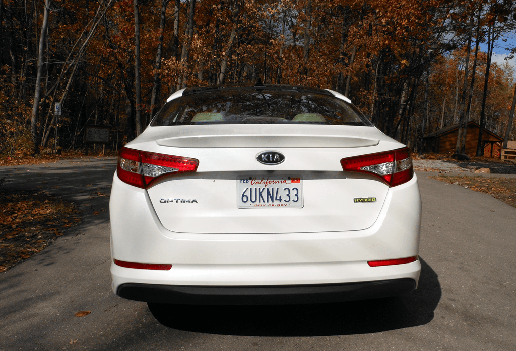 Straight-on rear view of the white 2012 Kia Optima Hybrid showing the wide taillights, chrome trunk trim, Kia badge, and clean lower bumper with no exhaust tips visible due to the hybrid powertrain.