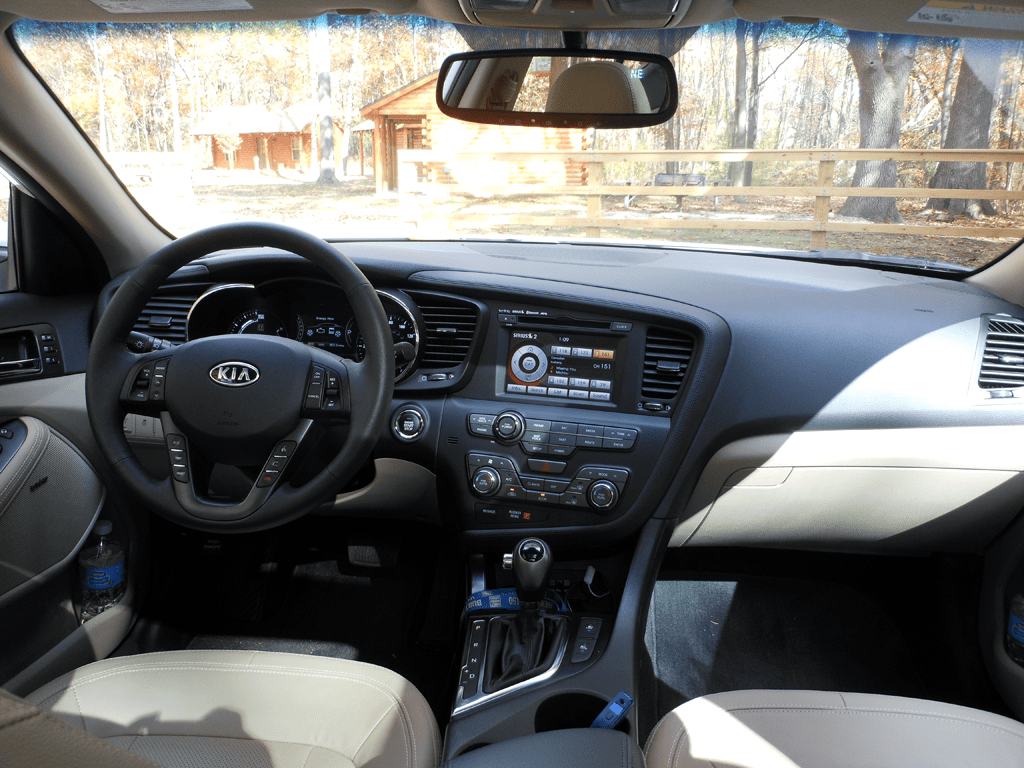 The 2012 Kia Optima Hybrid's well-appointed interior, featuring a driver-focused dashboard with touchscreen infotainment, Kia-badged multi-function steering wheel, and a light beige leather interior. The center console houses the automatic gear selector and HVAC controls.