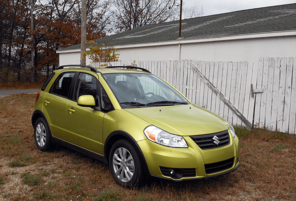 The 2012 Suzuki SX4 Crossover poses in front of a white fence in its vibrant yellow-green exterior, showcasing the bold front fascia, roof rails, and body cladding that set it apart from conventional compact cars. Alloy wheels and foglamps round out an adventurous appearance for everyday driving.