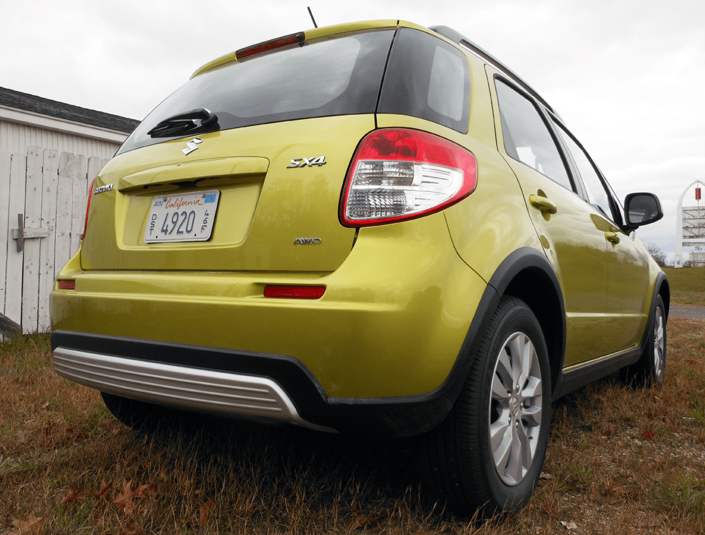 The rear of the 2012 Suzuki SX4 Crossover shows the SX4 badge flanked by wide LED-style taillamps and a chrome skid plate accent, all set in the distinctive yellow-green paint. The raised ground clearance and AWD badge are subtle reminders that this crossover is ready for more than just city driving.