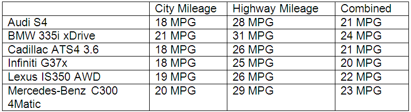 EPA fuel economy comparison table showing the 2013 Cadillac ATS4 3.6L AWD rated at 18 city / 26 highway / 21 combined MPG alongside competitors including the Audi S4, BMW 335i xDrive, Infiniti G37x, Lexus IS350 AWD, and Mercedes-Benz C300 4Matic.