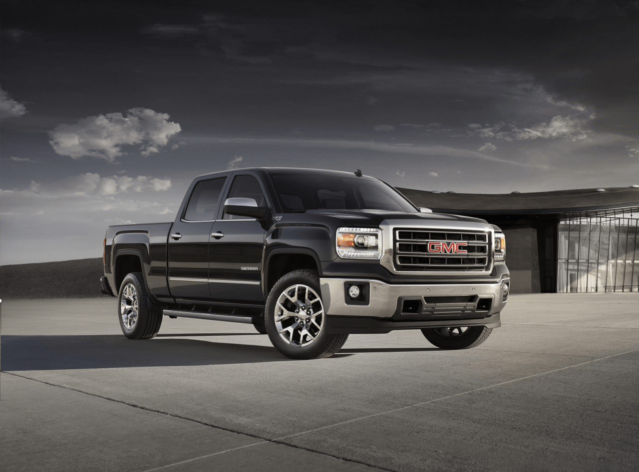 Three-quarter front studio press photo of the 2014 GMC Sierra Denali crew cab in Dark Graphite Metallic, showcasing the redesigned front fascia, chrome grille, and 20-inch aluminum wheels.