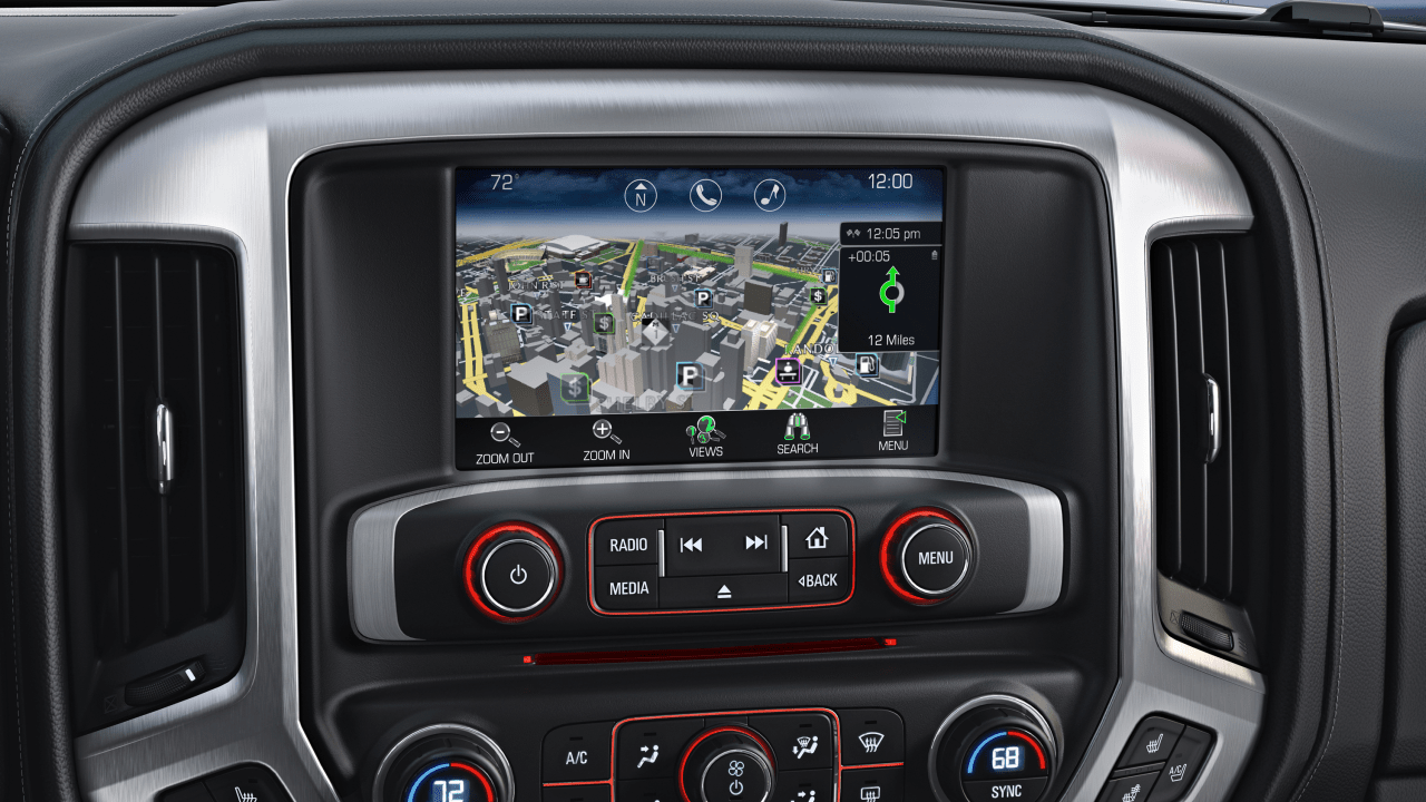 The 2014 GMC Sierra Denali IntelliLink 8-inch touchscreen displaying the built-in navigation map with an active route and turn-by-turn directions, with climate and audio controls accessible below.