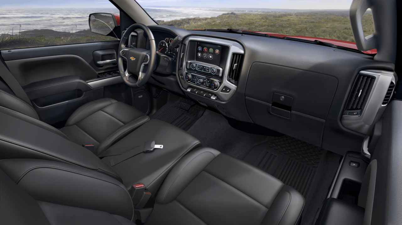 A wide-angle view from the passenger door of the 2014 Chevrolet Silverado LTZ reveals the full black leather interior, center console, and MyLink-equipped dashboard with a mountain panorama visible through the windshield.