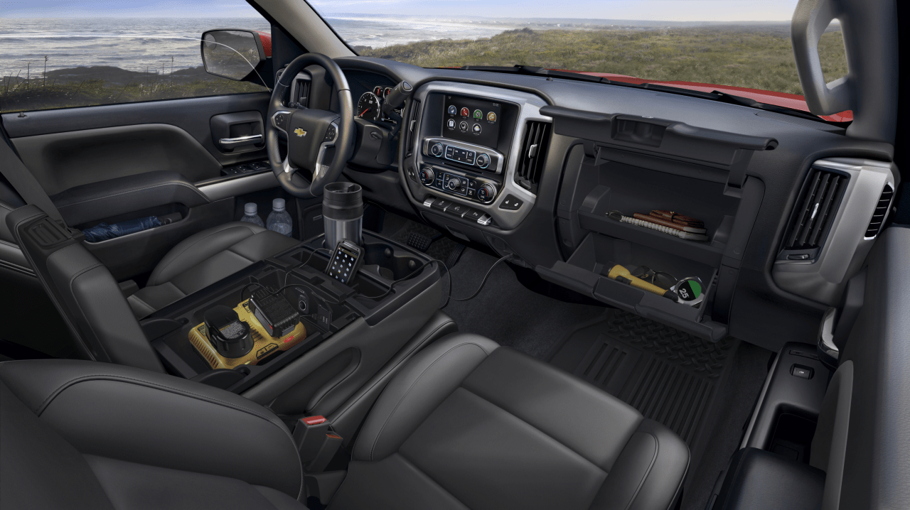 Interior press photo of the 2014 Chevrolet Silverado LTZ showing the front cabin from the passenger side, highlighting the center console storage, glovebox, and MyLink touchscreen infotainment with black leather seating.